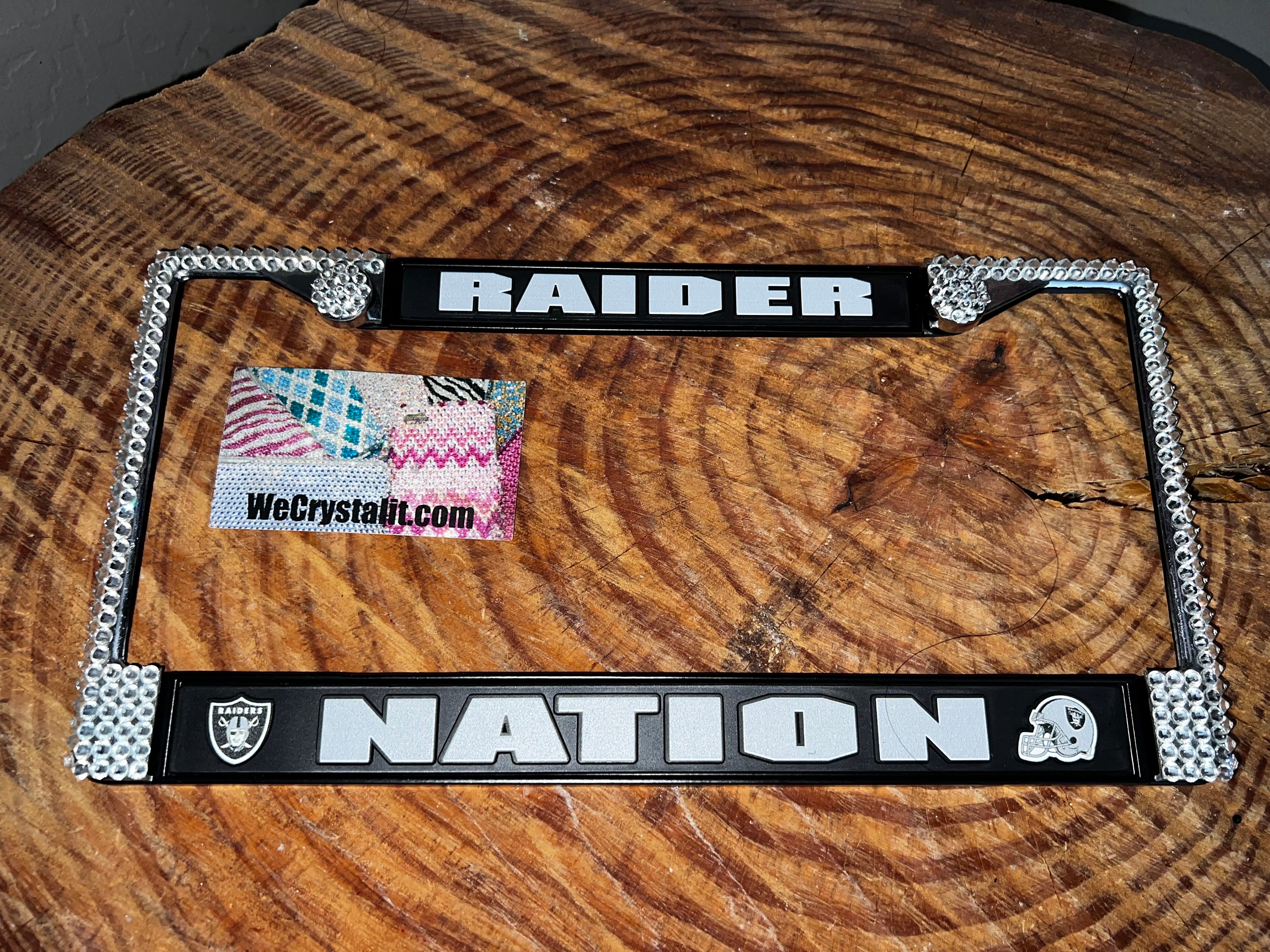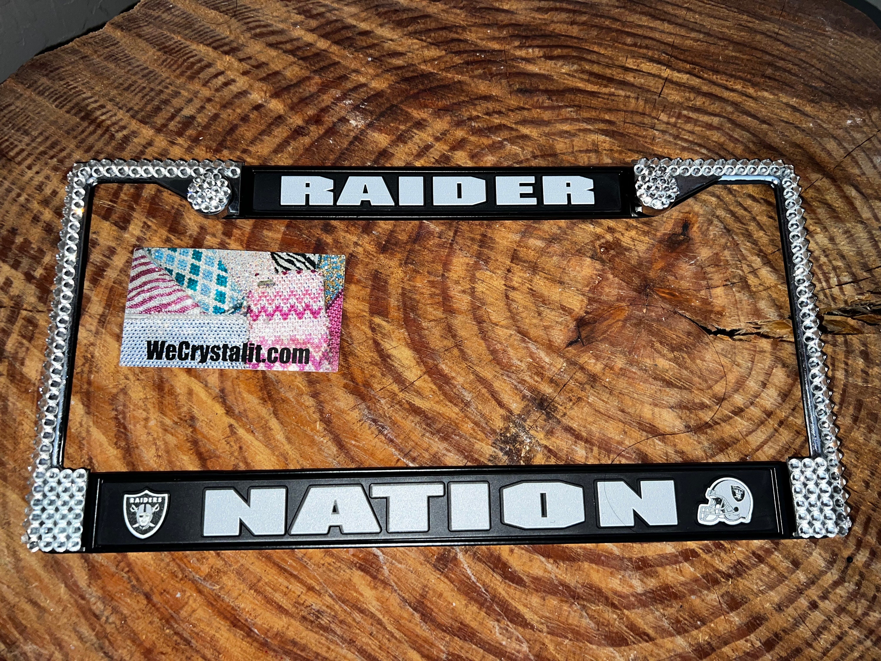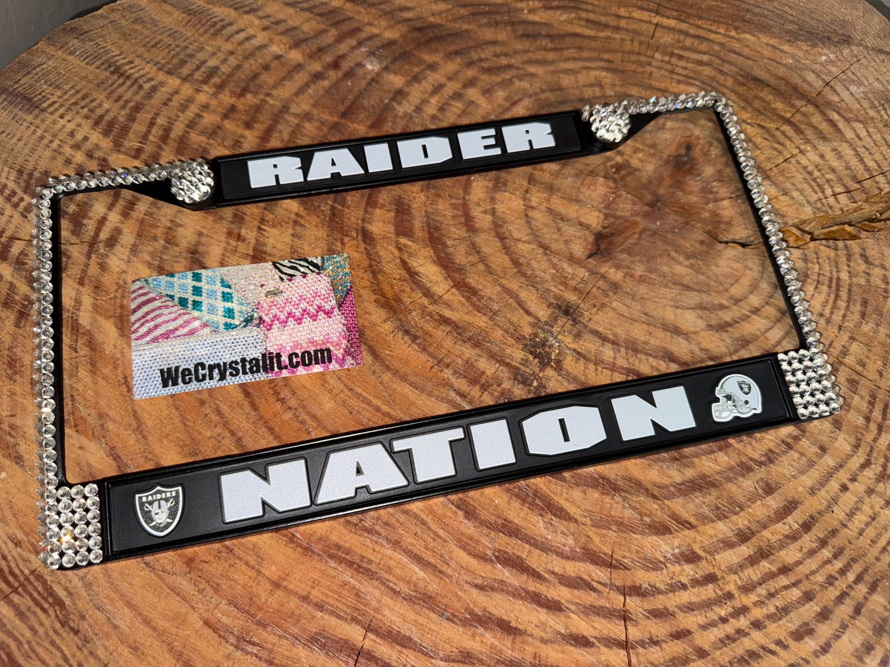 Las Vegas Raiders Nation Sports Bling License Plate Thicker on bottom so you only need two Holes to hold the plate on.