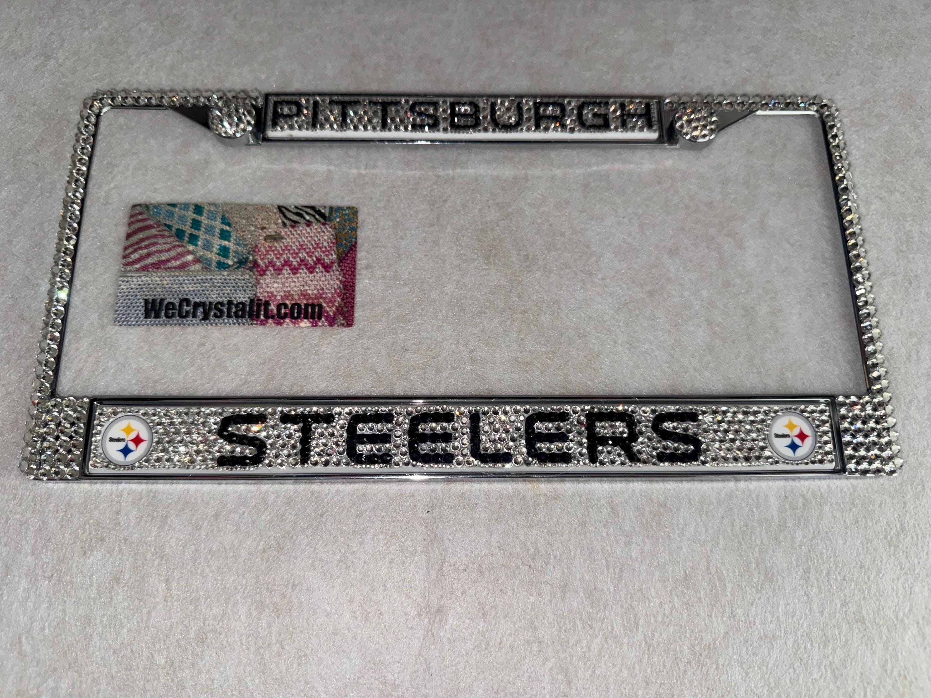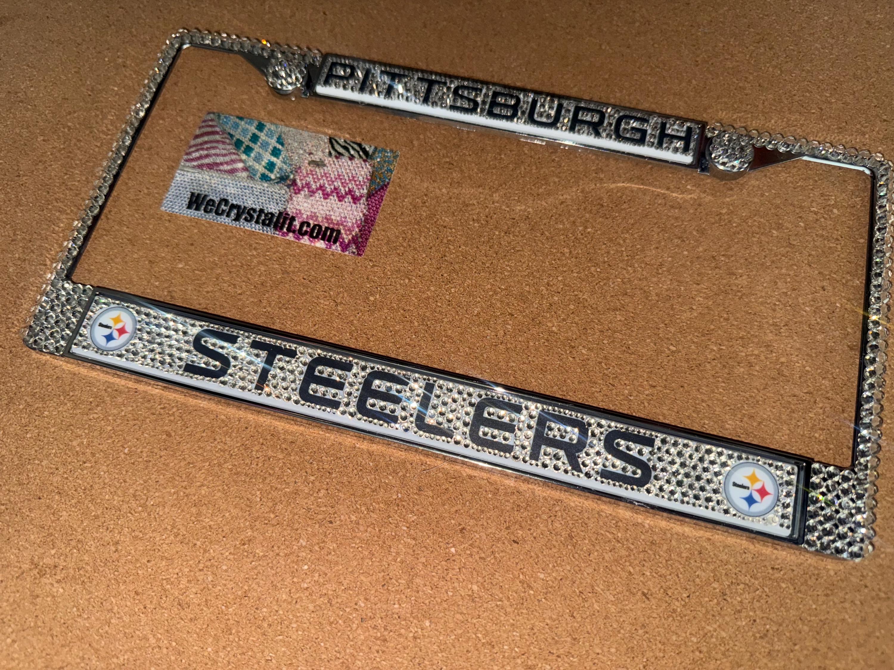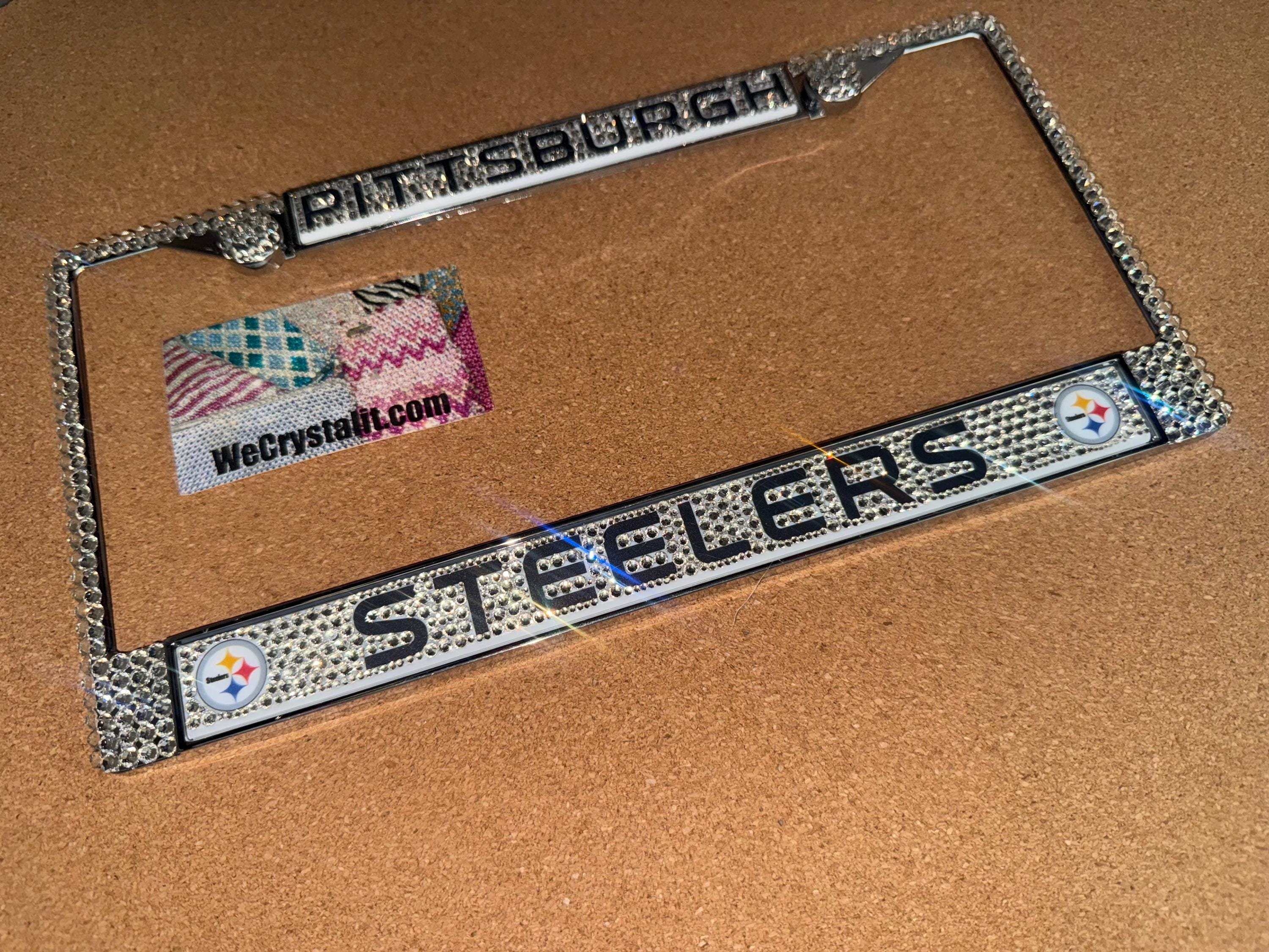 Pittsburgh Steelers Sports Bling License Plate Thicker on bottom so you only need two Holes to hold the plate on.