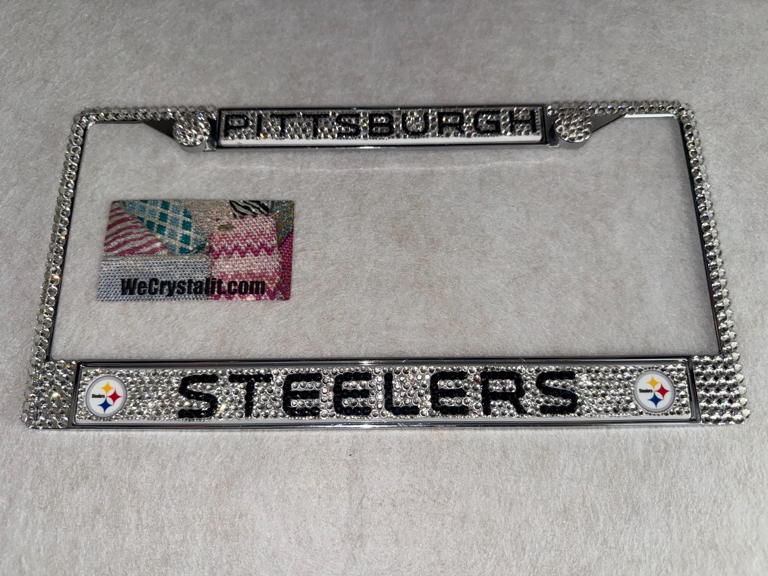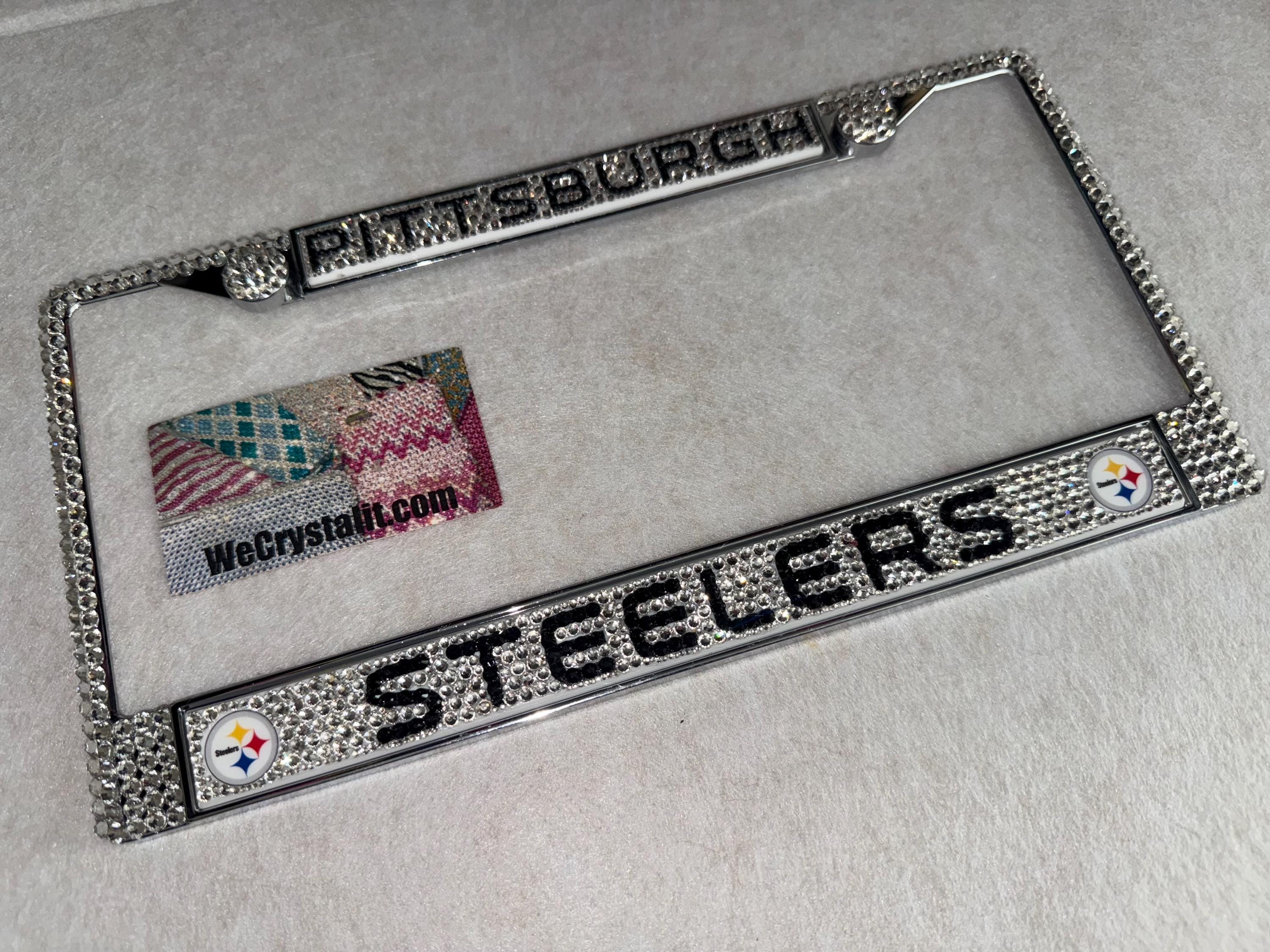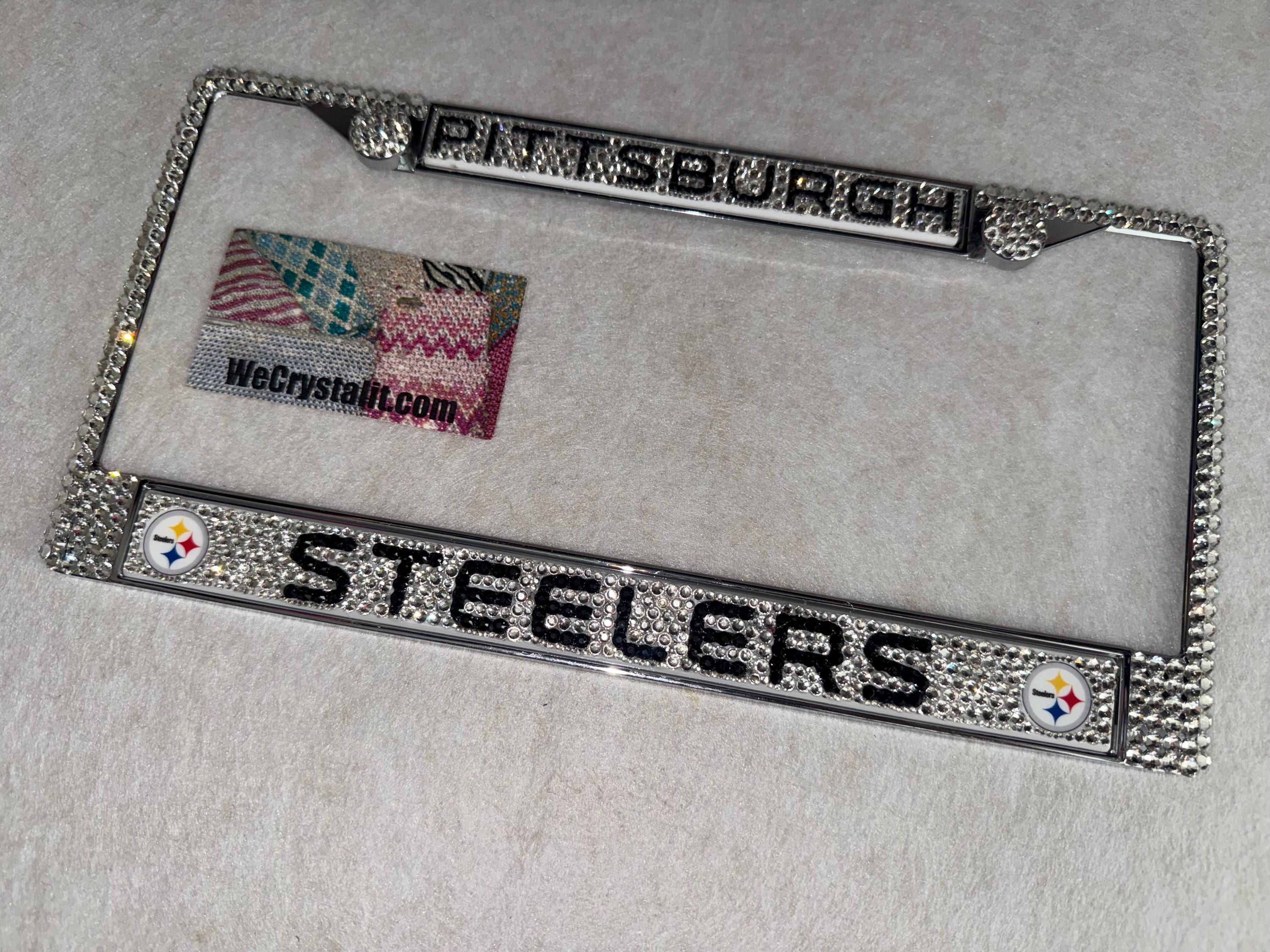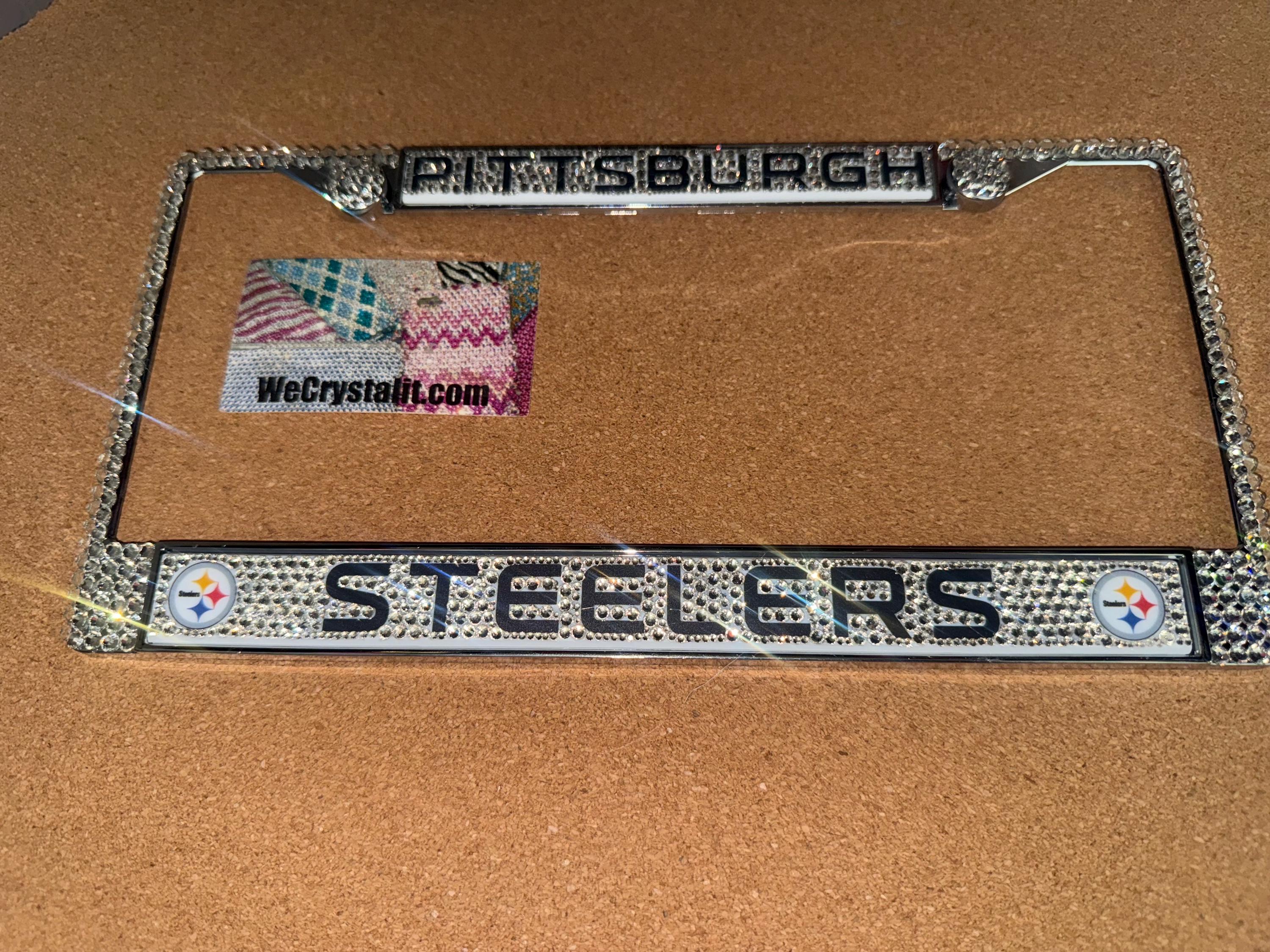 Pittsburgh Steelers Sports Bling License Plate Thicker on bottom so you only need two Holes to hold the plate on.