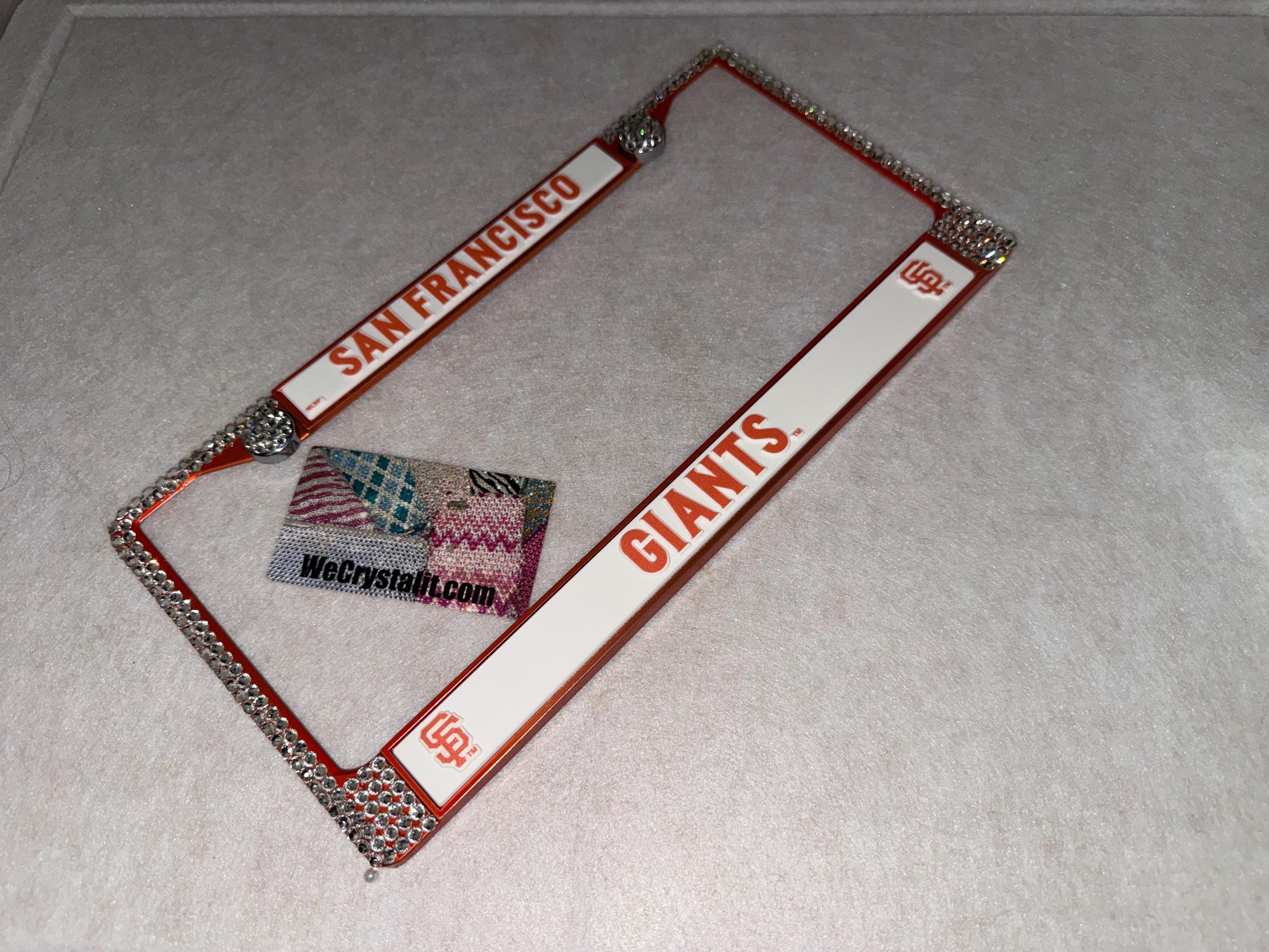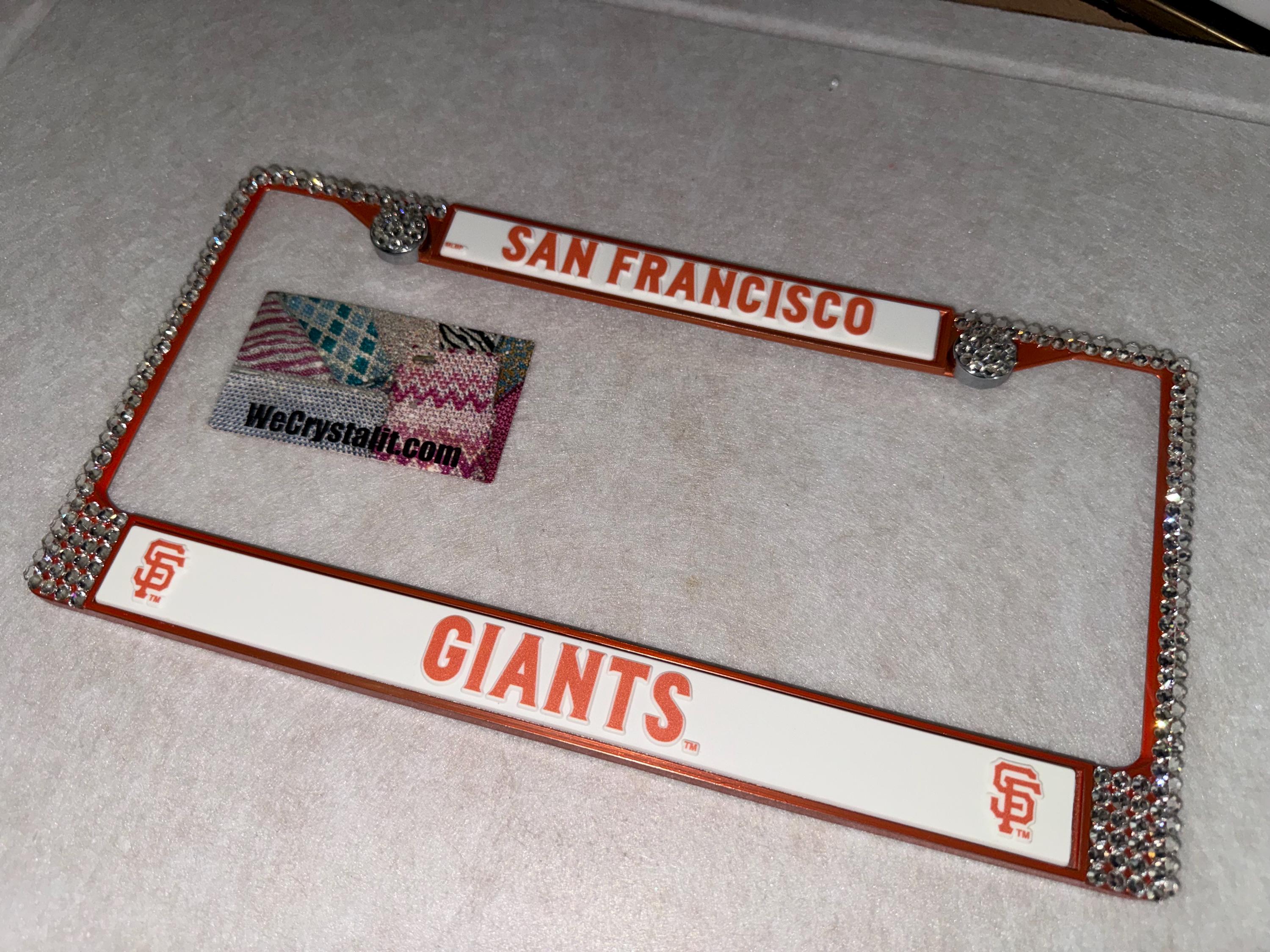 Giants plate made on a orange base frame. I have a limit number of the giants frames maybe 25 or so left onne I run out they will be discontinued. Sports Bling License Plate Thicker on bottom so you only need two Holes to hold the plate on.